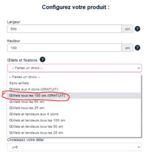 - Les œillets et tendeurs : les œillets permettent d’accrocher la banderole. Il est donc préférable de choisir l’option gratuite « Œillets tous les 100 cm ». Si vous visez une utilisation statique, sur des grilles d’un rectorat, ministère… les tendeurs peuvent être une bonne idée (l’option Œillets et tendeurs aux 4 coins semble gratuite).